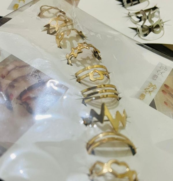 • Set of 10 stylish rings in golden, black, and silver.