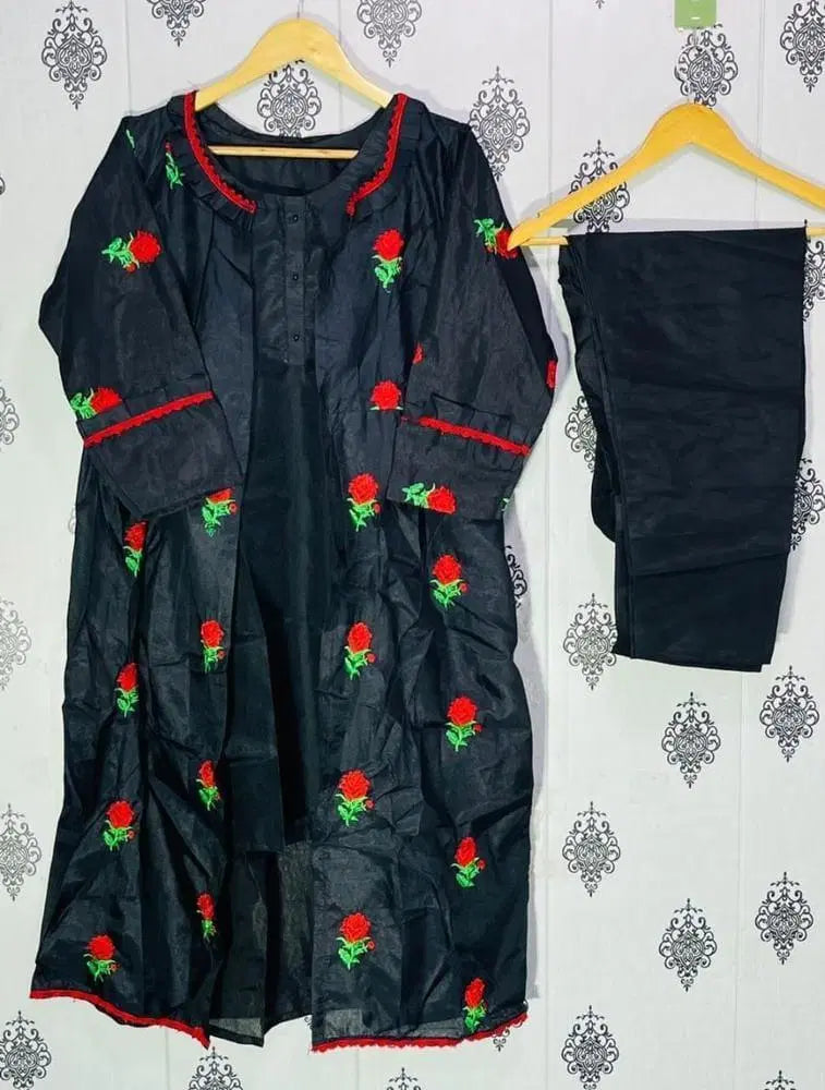 Enhance your look with this elegant 3-piece embroidered gown set, crafted from premium Katan Silk. Featuring a plain inner shirt and trouser paired with a beautifully embroidered gown, this outfit is ideal for formal occasions, festive events, or stylish evenings. The rich black color adds a timeless charm, making it a must-have in your wardrobe.